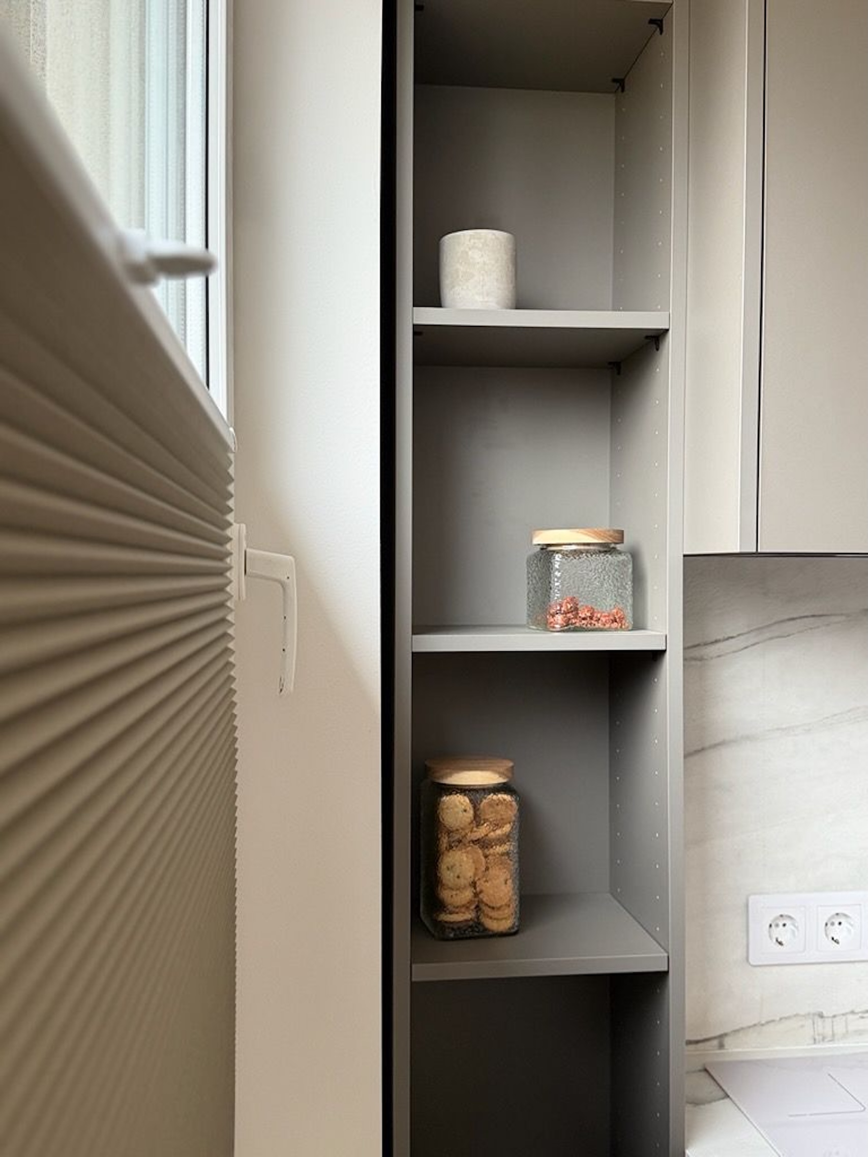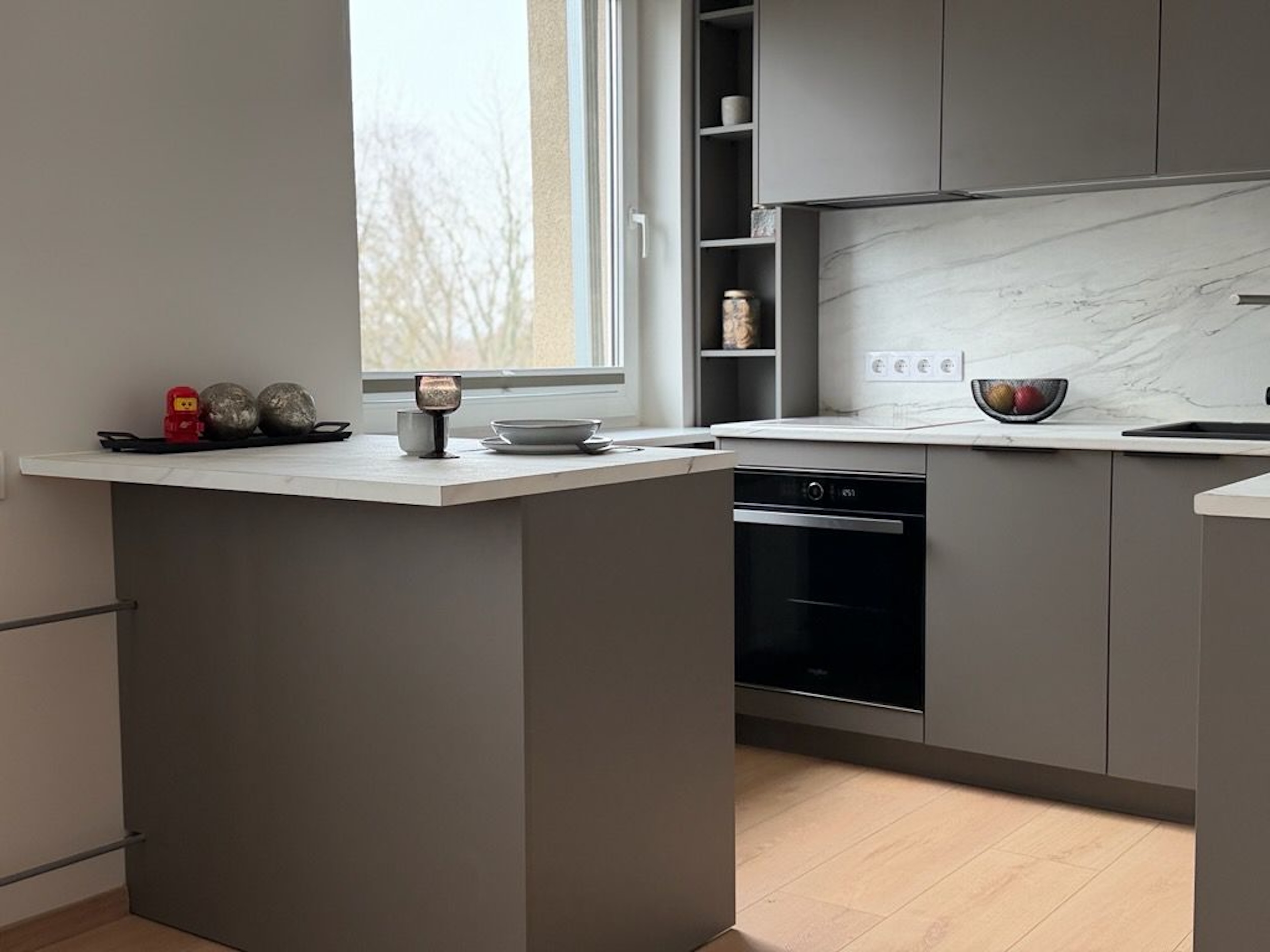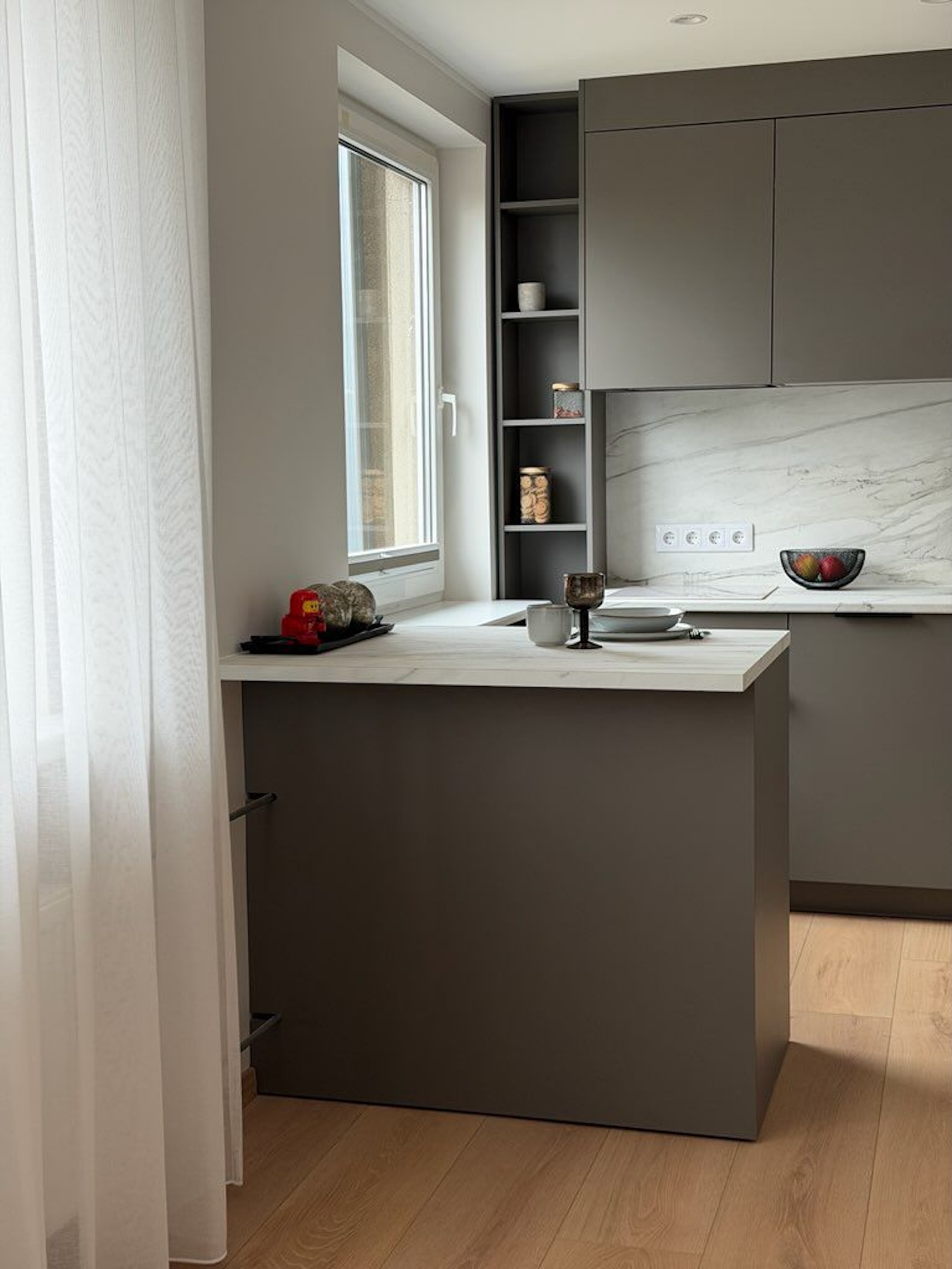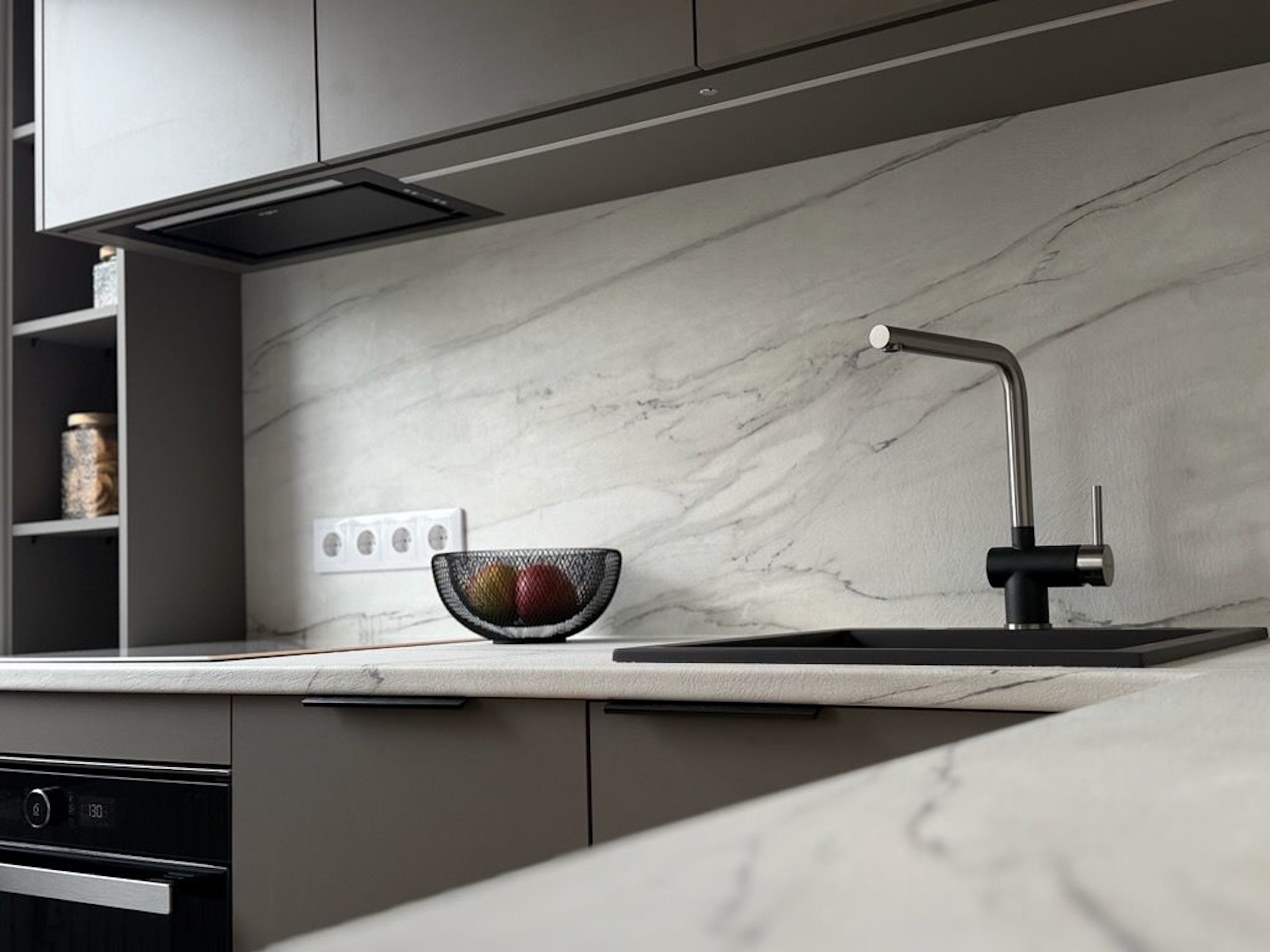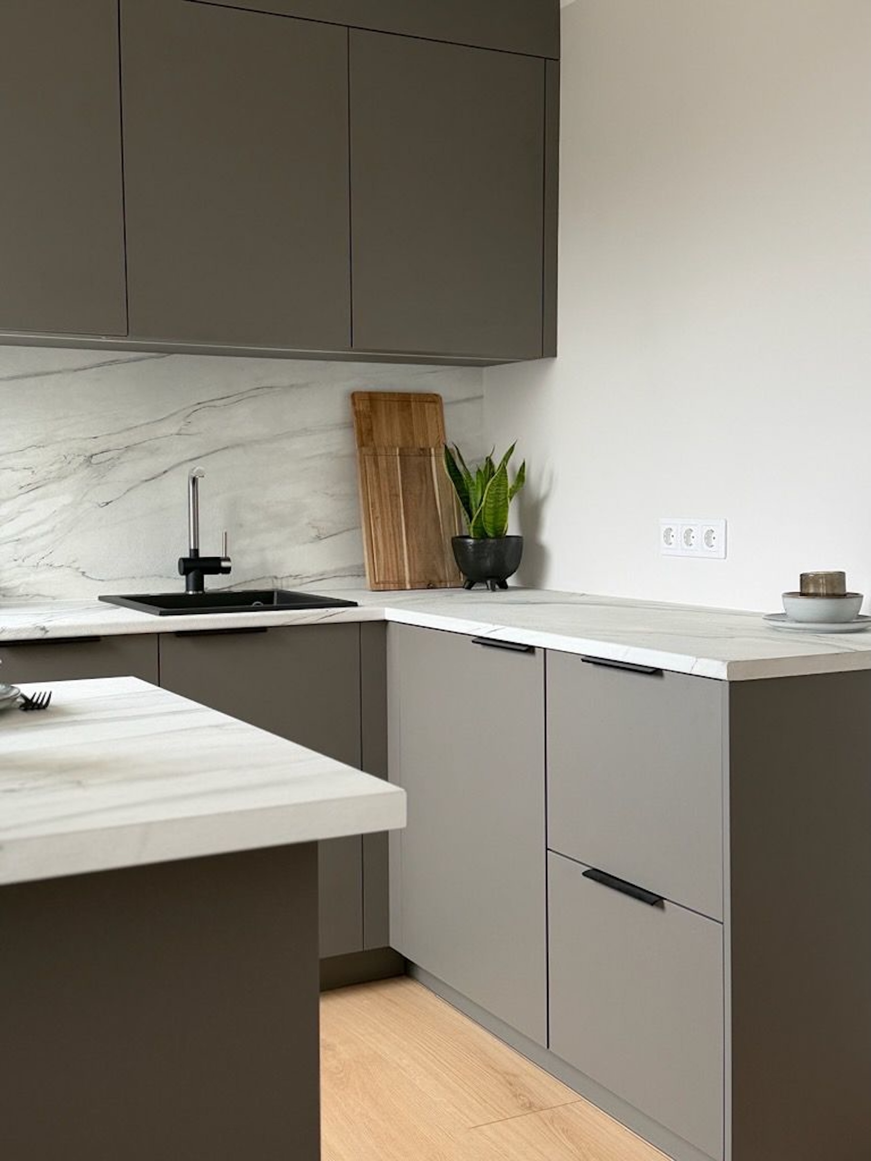 Kaasaegne väike köök Raplamaal – Nevada dekooruks, marmorit imiteeriv laminaattasapind ja mustad Lexa käepidemed. Kompaktne, ent väga funktsionaalne lahendus.